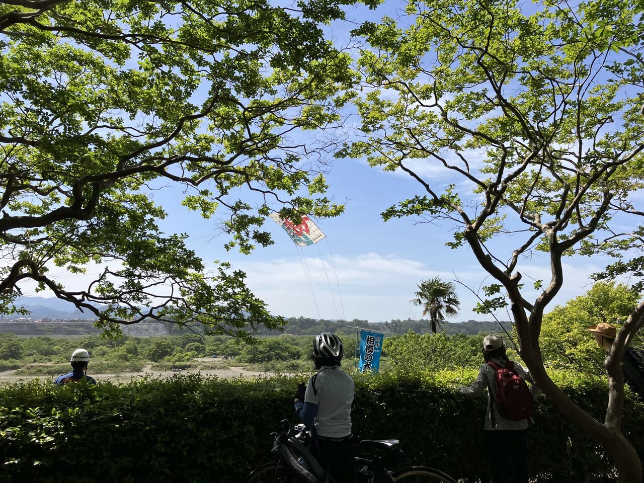 カーサイ組(3名)と鉄道輪行組(4名)は、カーサイ組が手賀沼大橋を渡った地点で合流する予定でしたがカーサイ組に時間の余裕があった様で、橋を渡らずに遠回りして沼を半周している途中で合流できました。